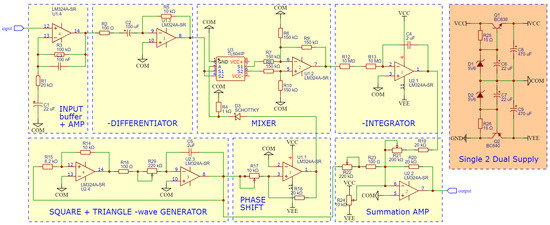 The CLC prototype was manufactured with through-hole technology elements as there are no high-frequency requirements for this part of the system. Figure 7 is a schematic with the orange block showing the power-supply adapter and the yellow block implementing the concept from the block diagram in Figure 6. The input buffer stage is designed as an active band-pass filter with approximately 14 dB of gain. The lower cut-off frequency is set to block the (near) DC term , while the upper cut-off frequency limits the bandwidth to reduce the higher-frequency noise. The mixer is built of a differential amplifier and a CMOS switch, which is triggered by a rectified square-wave voltage. So, in this case, the mixing behavior is achieved by multiplying the signal from the differentiator by −1 or 1, alternately. The square and triangle -wave generator is realized as a combination of a Schmitt-trigger circuit and an integrator op-amp circuit, where the trimmer R29 adjusts the frequency. The tunable phase shift is achieved with an additional Schmitt-trigger circuit with adjustable threshold (R17) that is triggered by a triangle-wave output from the generator. A summation amplifier combines all the signals, while letting their magnitudes be varied by means of R21, R22 and R24.
