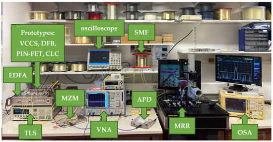 Figure 9 shows the laboratory-built prototypes that were synthesized, designed, and manufactured to accommodate the experimental evaluation of the proposed concept. In the photograph, viewed from left to right, these are the VCCS, the DFB module, the PIN-FET module, and the CLC prototype.