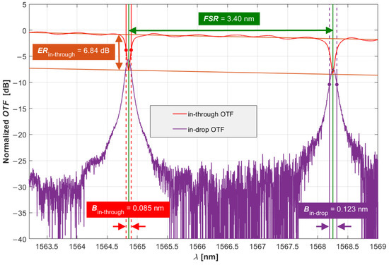 MRR6′s optical transfer functions in the in-through (red curve) and in the in-drop (purple curve) directions.