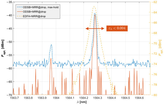 This carrier is subsequently modulated by the RF signal at the Mach–Zehnder modulator (MZM) (Figure 4b), which in the first approximation introduces a 3-color (higher-order harmonics are neglected, assuming the MZM is biased at the quadrature point) signal to the MRR’s input. All three resulting wavelength components are subject to temperature fluctuations , where , where is the speed of light in vacuum and is the RF modulation frequency. The corresponding power spectrum is: