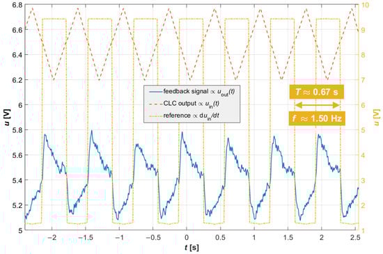 The locking state was achieved and the measurements performed with the CLC set to a frequency of as can also be seen from the Figure 15. This figure shows the oscillogram with voltage measurements at several points of the CLC circuit. The red dashed line presents the voltage signal controlling the VCCS, the orange dash-dotted line shows the rectangular signal with the phase corrected and fed to the input of the mixer, and finally the blue solid line presents the signal measured after the buffer amplifier at the input of the CLC. This last is actually the feedback signal that is essential for our concept of wavelength locking.