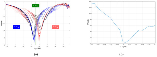 (a) Combined PP measurements for wavelength misalignments in the range −1 to 1 nm with an increment of 0.1 nm; (b) PP deterioration at a critical frequency and those wavelengths.