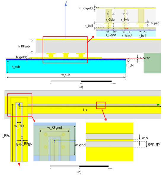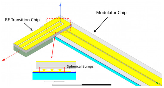 The structure consists of a modulator chip, an RF transition chip, and spherical bumps for bonding between them. As shown in Figure 1, the RF transition chip designed in this paper is misaligned with the modulator in the Z-axis direction (non-coplanar structure), and the electrode structure of the modulator does not need to be provided with a 90° curved electrode structure. The radio frequency transition chip is perpendicular to the modulator on the x–y plane. The RF transition chips are located on top of the modulator, and they are perpendicular to each other in the x–y plane. Figure 2 and Table 1 show detailed parameters of the BBDP structural design.