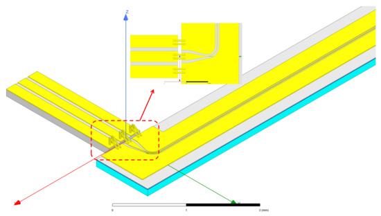 The parameters and simulation settings of the modulator and RF transition chip in the above structure were the same as in the BBDP simulation. The difference was that to wire bond the modulator and the RF transition chip, the electrode structure was bent at a 90° angle. As shown in Figure 10, the bending radius was 180 µm and the tapered transition structure was 250 µm long. The signal electrode in the bonding area was 100 µm wide and the GS spacing (gap between the signal electrode and the ground electrode) was 40 µm.