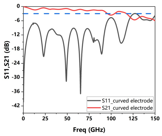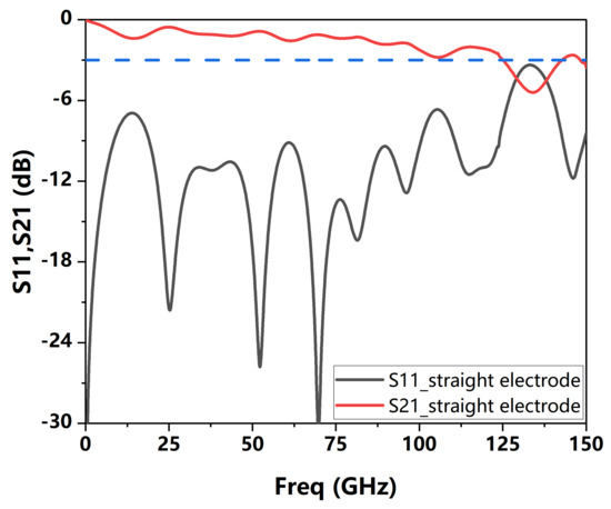 In addition, considering that the curved design of the modulator electrodes can be avoided by straight-like electrodes [20], we also simulated and compared the RF interconnection structure of the straight GSG electrodes. Figure 12 shows the radio frequency interconnection model of straight GSG electrodes, and its specific structural parameters were consistent with the previous curved electrode structure. Figure 13 shows the S parameter simulation results of this model. The 3 dB transmission bandwidth of S21 was approximately 125 GHz.