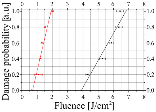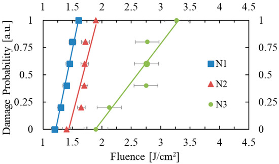 The comparison of the experimental results and the calculated statistical parameters demonstrated a four times higher LIDT (both the average fluence and the 0-probability LIDT fluence) for sample N2 in comparison with sample N1 (Figure 2).
