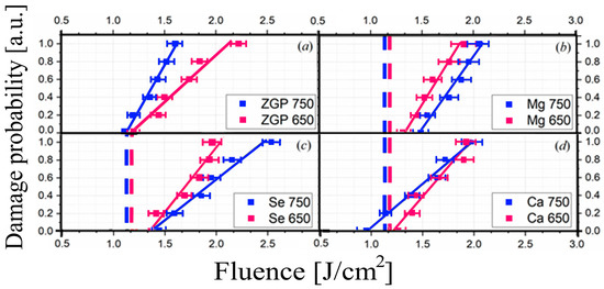 Dependence of the probability of optical damage on the energy density of the incident laser radiation with a wavelength of 2.1 μm in undoped samples (a), and in doped samples with Mg (b), Se (c), and Ca (d). Approximate plots in black and red correspond to ZGP samples annealed at 750 °C and 650 °C, respectively (adapted from [39]).