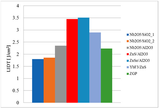 Using the specified technology, AR coatings for various pairs of film-forming materials were developed. Information on the coating materials and their parameters is given in Table 3. For clarity, a histogram of the LIDT of ZGP crystals, depending on the type of AR coating, is shown in Figure 4.