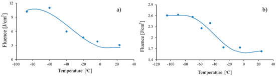 Measurements of the dependence of the LIDT on the crystal temperature were also performed with a laser beam diameter of 270 μm. The measurement results demonstrated a similar dependence of the LIDT on the crystal temperature (Figure 7b). In the temperature range from +24 to −106 °C, an increase in the LIDT value of more than 1.5 times (from 1.6 to 2.6 J/cm2) was observed, and the increase in LIDT also stopped at temperatures below −60 °C.