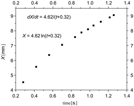 Using the available experimental data and the ORIGIN LAB mathematical software, a logarithmic dependence of the track length on the time of exposure was obtained (see Figure 11). The dependence of the speed of propagation of the luminous spot in a ZGP crystal at a beam fluence of 0.3 J/cm2 obtained by the least squares method is a smooth monotonic function of the current time: