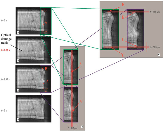 In the photographs in Figure 13e,f, the reconstructed images of the crystal before laser exposure and at the moment when the glowing (luminescent) spot reached the front surface of the crystal are shown. By comparing the geometric (dimensional) parameters of the images, it was found that at the final stage of optical damage, when the formation of the track is completed, the length of the crystal in the longitudinal direction at the point of exit of the track to the surface increased by ~dL = 117 μm (Figure 13f), and in the transverse direction it decreased by ~ 103 μm (Figure 13e).