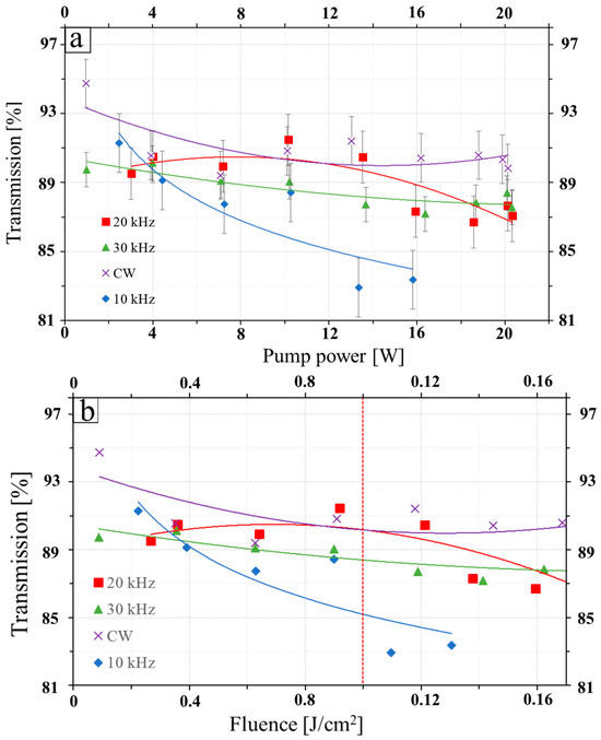 Dependence of the transmission on the incident pump power (a) and dependence of the transmission on the pump fluence (b). The different color lines indicate the corresponding PRR (adapted from [69]).