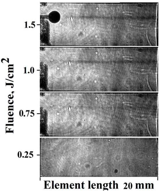Figure 20 shows the restored holograms. At a power of up to 0.7 J/cm2, the holographic camera did not detect any changes. With an increase in the pump fluence from 0.7 to 0.9 J/cm2, the formation of a dark area along the entire length of the crystal was observed. With an increase in the fluence to 1.2 J/cm2, this area became darker. At a power of more than 1.2 J/cm2, a damaged track inside the ZGP element was registered.
