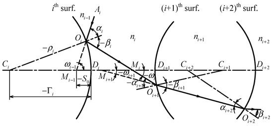 In Equation (13), and mean the refraction index of the object and image space. means the wave aberration coefficient of object beam pencil, which is calculated by Equations (11) and (13)–(16) in ref. [14]. and mean the meridional and sagittal focal distances along the chief ray in the image space of the gth optical surface; they can be obtained with the conditions of the wave aberration coefficients, and and [10] are applied sequentially to every optical surface as
