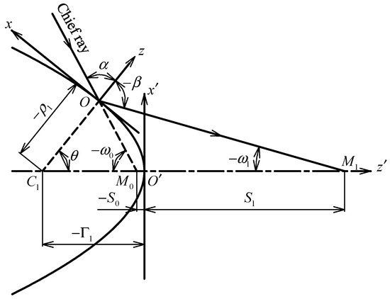 To apply the plane-symmetric aberration theory [13,14] for calculating the wave aberration of an off-axis point object, we first need to take the coordinate system as the coordinate origin , whose origin is an intersection of the chief ray and the optical surface, as shown in Figure 2. It shows a chief ray is reflected by a quadric of revolution. The axis is the normal to the surface and the axis is along the tangent direction in the meridional plane. is the angle between normal at and the optical axis.