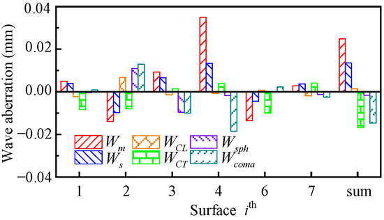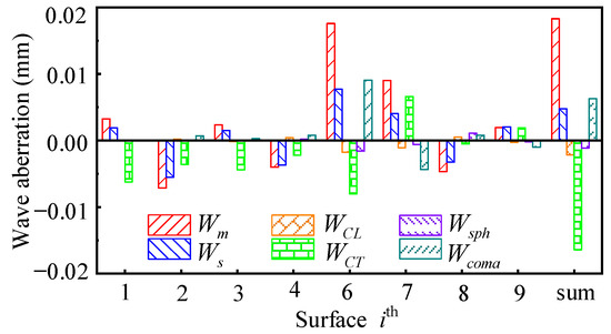 The contributions of these types of wave aberrations from the first to the (g − 1)th optical surface are also calculated with Equations (18)–(20). The wave aberration of field curvature and chromatic contribution from the gth optical surface should be calculated by