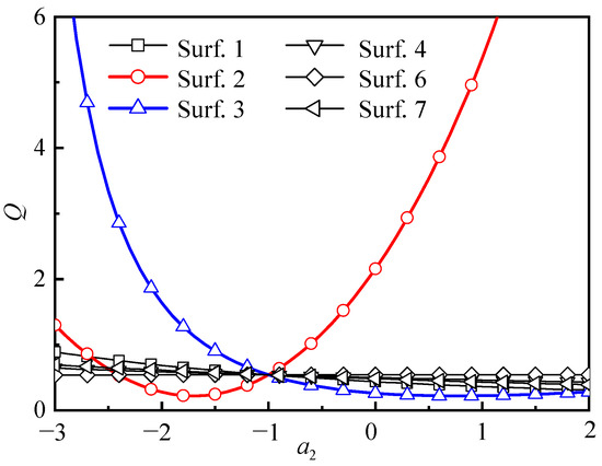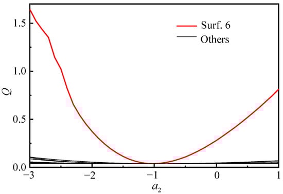 In the aberration theory of plane-symmetric optical systems, we calculated aberrations with the parameters of the chief ray parameters , , and of each optical surface. These parameters are all related to the figure coefficients . According to Equations (8) and (9), is determined by the parameters and of the optical surface. represents the radius of curvature of the optical surface at the vertex, and represents the aspheric coefficient of the optical surface. Therefore, the evaluation function Q in Equation (25) is related to the aspheric coefficient . We calculate the variation curve of Q with for each optical surface to determine the optimal position of the aspheric surface and the corresponding initial value of . This enables the optical system to have the best imaging performance (that is, Q is the minimum).