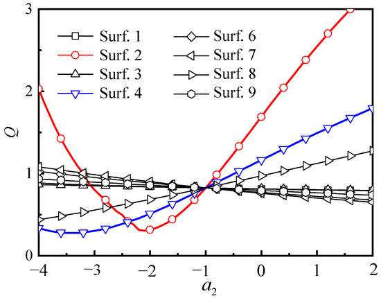 Similarly, the curve of the Q with of each optical surface of fisheye lens II is shown in Figure 8. The search range of is [−4, 2] with a step of 0.01, and the field angles are set to , , , , , , , , and . , and are set to 1.