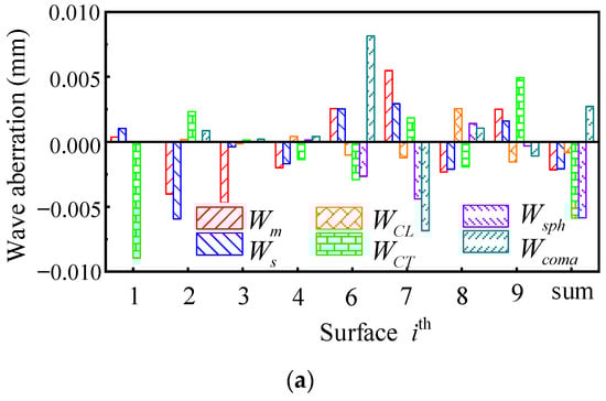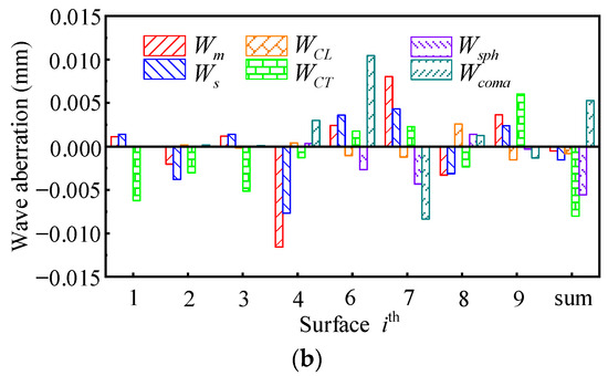 The diagram shows the wave aberration distributions of lens I at . They are recalculated with Equations (17)–(22), and only the of the sensitive optical surface is changed. (a) shows and (b) shows , respectively.