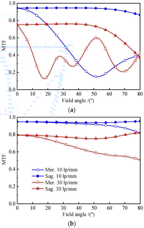 The diagram shows the MTF curves of fisheye lens III. (a) shows the MTF curve of the original fisheye lens III; (b) shows the MTF curve of the optimized fisheye lens III, with . Their optical parameters are listed in Table 5.