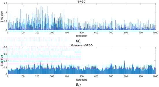 - SPGD vs. others. The adjacent step size varies abruptly in the iterative procedure of SPGD (Figure 7a), whereas it shows much more consistency between adjacent steps for the other three algorithms. The consistency of step size is essentially due to taking the momentum of inertia into account, as in the case of Momentum-SPGD, Adam-SPGD, and CoolMomentum-SPGD.