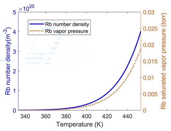 Rb saturated vapor pressure and Rb number density at different temperatures, as calculated from Equations (3) and (5).