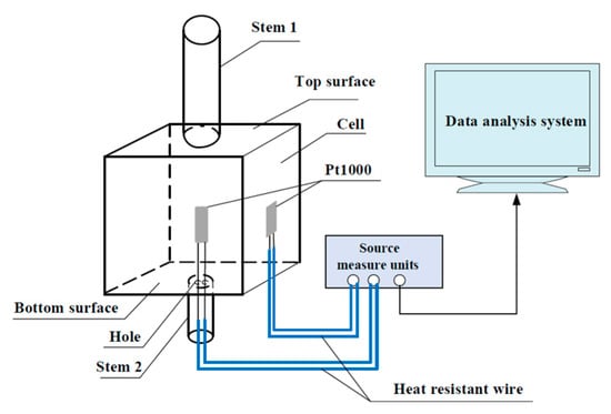 In order to realize the direct and effective measurement of the internal temperature of the cell, the design method of this paper is to seal the platinum temperature sensor (PT1000) into the glass cell and design the cell as a double stem. The schematic of the temperature-measuring device design is shown in Figure 3.