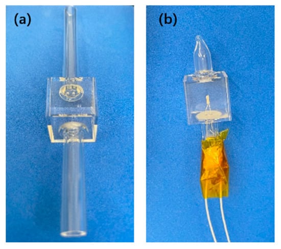 During the manufacturing process, it should be noted that when we tried to seal the two pins of the platinum temperature sensor with the Pyrex stem, it was found that the vacuum degree of the seal was not good enough (leak detector > 1 × 10−8 Pa·m3/s). The reason for this phenomenon is that the thermal expansion coefficients of Pyrex glass and the platinum temperature sensor pins are different. The thermal expansion coefficients of Pyrex glass, Dumet, Kovar alloy, and platinum are 3.3 × 10−6 K−1, 8 × 10−6 K−1, 5 × 10−6 K−1, and 9 × 10−6 K−1, respectively.