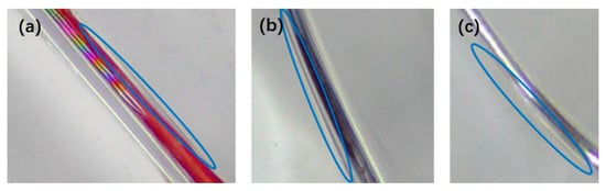 The sealing conditions of Pyrex glass and the different kinds of metal wires. The gap between Pyrex glass and the metal is marked by blue ellipses. (a) Dumet wire. (b) Kovar alloy. (c) Platinum wire.