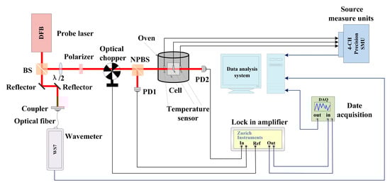 The experimental setup is shown in Figure 6, in which the cell created in Section 3.2 is placed in an electric wire oven and then heated by thermal radiation. The probe laser is a distributed-feedback (DFB) laser with a center wavelength of 795 nm. The wavelength of the probe beam is measured in real time, using a wavelength meter (Highfinesse WS7, Germany). In the experiment, the combination of a half-wave plate and a polarization beam splitter (PBS) is used to adjust the light intensity of the beam, to ensure the linear polarization of the beam. A non-polarizing cube beam splitter (NPBS) is used to divide the linearly polarized beam into two beams with equal light intensity, one of which is received by the photodetector 1 and the other enters the oven. The probe beam can enter the cell through the optical aperture on the wall of the oven and enter from the center of the cell. At the same time, it is necessary to avoid platinum resistance to prevent it from blocking the detection light. Since the light intensity used to measure the density of 87Rb is weak (< 1 uw), the measurement system needs to use an optical chopper (Thorlabs mc2000b, photo mc2f330, America) to modulate the probe beam; the modulation frequency here is 350 Hz. After that, the output signal of the photodetector is demodulated by the lock in the amplifier. Finally, the output signal of the temperature sensor is collected by the host computer and demodulated by the phase-locked amplifier.