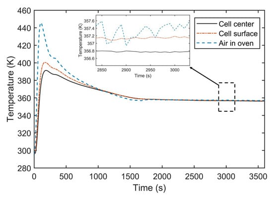 Experimental results at various temperatures. The temperature of the cell center is plotted as a solid line, the temperature of the cell surface is plotted as a dash–dotted line, and the temperature of the oven is plotted as a dotted line.
