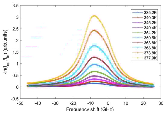 The experiment was carried out at ten different temperatures, in which the cell was in the absorption spectrum near the 87Rb D1 line. During the measurement process, the light intensity of the detection laser needs to be continuously reduced until the line shapes no longer change. The experimental results in the wavelength range of 794.925 nm~795.075 nm are shown in Figure 8, where the abscissa is the frequency of the detection beam offset D1 line. It can be seen that the height of the spectral line increases visibly with the increase in temperature.