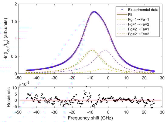 The line shape of the alkali metal absorption spectrum has been described in Section 2.2. For fitting the data, Equation (8) can be rewritten as: