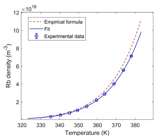 By substituting the fitting coefficient, a, and line width (FWHM) under different temperatures into Equation (10), the density of 87Rb at the corresponding temperature can be obtained. The comparison between the 87Rb density, as measured by the absorption spectrum, and the 87Rb density (Equation (5)) derived from the empirical formula, Equation (1), for the saturated vapor pressure is shown in Figure 6. It can be seen that the growth trend of the absorption spectrum’s experimental results is consistent with the empirical formula of saturated vapor pressure, but the experimental results are smaller than the calculation results of Equation (5).