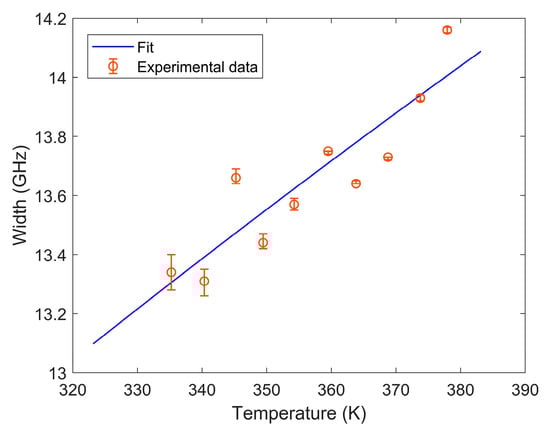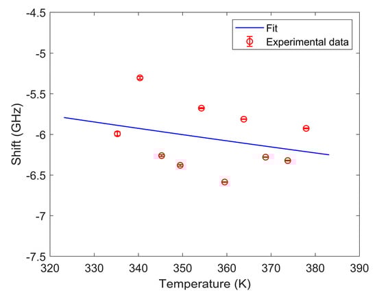 Figure 11 and Figure 12 show the fitting results of the relationship between the measured line widths, as well as the frequency shifts and the temperature, in which the fitting formulas that are used are as follows: