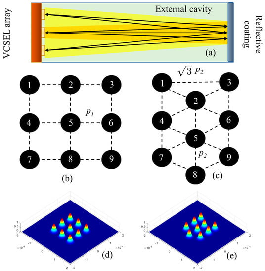 (a) Diagram of parallel-coupled external cavity VCSEL array; (b) position distribution of initial plane of square array; (c) position distribution of initial planar of regular hexagonal array; (d) the initial planar amplitude distribution of the square array; (e) initial planar amplitude distribution of regular hexagonal array.
