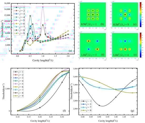 where is the composite reflectance [28] of the (the reflectance of p-DBR) and (the reflectance of external cavity’s optical film), is the reflectance of n-DBR, is the confinement factor, is the gain threshold, is the loss in the internal cavity, is the equivalent length of the internal cavity. By replacing Equations (2) and (3) with the above self-reproduction condition, the gain threshold condition of the j-th supermode can be obtained: