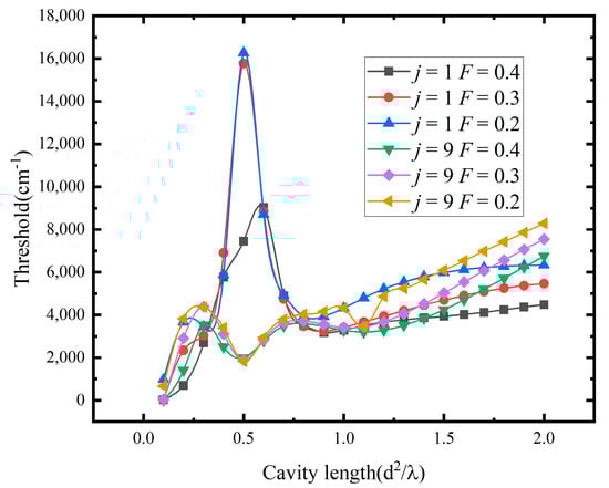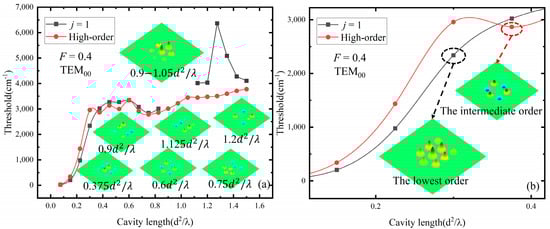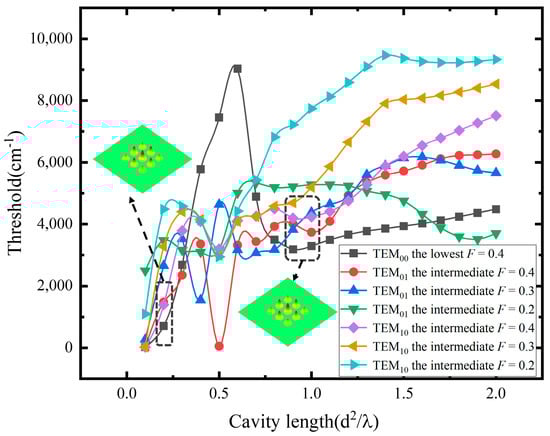 A larger array duty ratio, F, is conducive to the diffraction coupling of the external cavity and provides a lower threshold. As for the lowest supermode output of j = 1, composed of TEM00 mode obtained by the external cavity system, the influence of duty ratio F on the supermode threshold composed of high-order transverse mode elements versus the external cavity length obtained by simulation is shown in Figure 7.