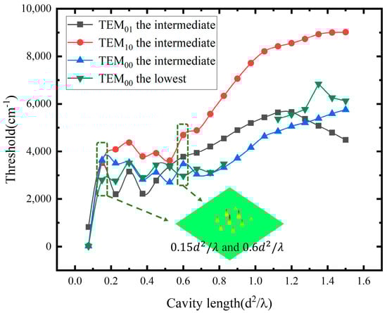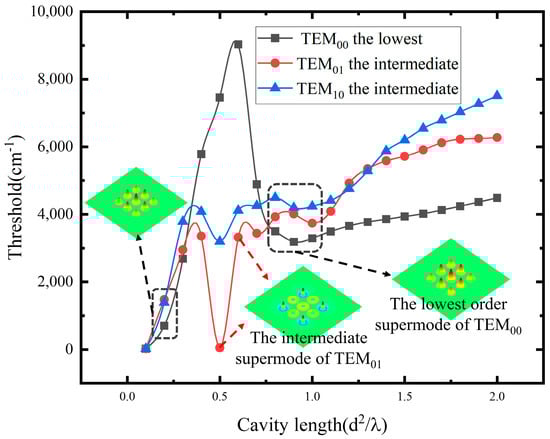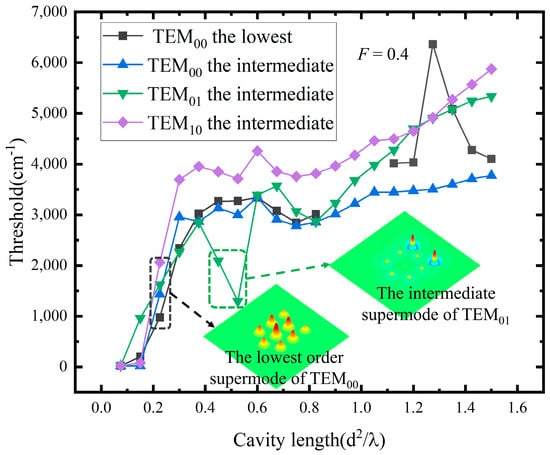 The thresholds of supermodes generated by the TEM01 and TEM10 high-order transverse mode element arrays and the thresholds of the supermode with the lowest mode square array generated by the TEM00 transverse mode versus the length of external cavity from .