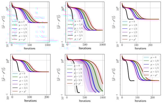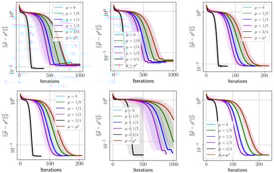 where denotes the adjoint of U, and is re-parametrized with . The motivation for this reformulation is two-folds. First, by representing the dimensional density matrix with (the outer product of) its dimensional low-rank factors U, the search space for the density matrix (that is consistent with the measurement data) significantly reduces, given that . Second, via the reformulation both the PSD constraint and the low-rank constraint are automatically satisfied, transforming the constrained optimization problem in Equation (1) to the unconstrained optimization problem in Equation (3). An important implication is that, to solve Equation (3), one can bypass the projection step onto the PSD and low-rank subspace, which requires a sigular value decomposition (SVD) of the estimate of the density matrix on every iteration. This is prohibitively expensive when the dimension is large, which is the case for even moderate number of qubits n. As such, working in the factored space was shown to improve time and space complexities [26,30,31,32,33,34].