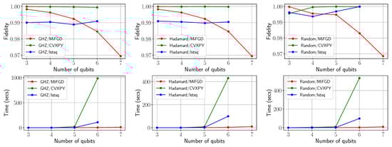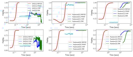 - We provide the implementation of our approach at https://github.com/gidiko/MiFGD (accessed on 18 January 2023), which is compatible with the open-source software Qiskit [28].