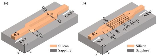 Considering that the light released by the silicon waveguide interacts with the gas to be measured, it is used for gas absorption sensing. Next, the slot waveguide and SWGS waveguide will be simulated for the optimized value of η. Figure 2a,b show relevant parameters such as the width of the strip waveguide (W), the length of the tapered waveguide (L), the width of the slot waveguide (Ws), and the gap size (Gap). For the SWGS waveguide, the period (p) and the segment length (a) of periodic silicon are described in Figure 2b. Up to now, the formation of the majority of slot waveguides originated from mode-coupling between some irregular taper segments [29,30,31], and the width of the slot gap is less than 50 nm. This paper investigates a simple structure, including an inverse taper waveguide between the strip waveguide and slot waveguide, with a gap of 200 nm. The coupling efficiency from the strip waveguide to the slot waveguide can reach 90% when L = 2.00 µm; the coupling efficiency is calculated as the ratio of the optical power at the output of the inverted tapered waveguide, to the optical power at the input of the strip waveguide. The light propagates forward in the gap, generating an absorption phenomenon with the gas to be measured.