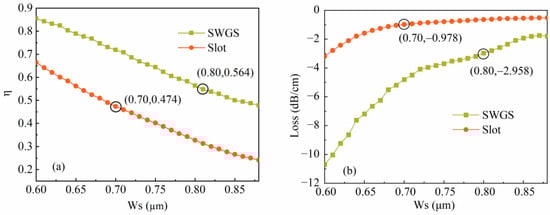 Figure 3a,b, respectively, show that the η and the propagation-loss change with the Ws for the slot waveguide and SWGS waveguide. The pictures show that the optical power released by the SWGS structure is obviously higher than that of the slot structure, but its loss will also increase. When Ws = 0.85 µm, η is 0.56 and 0.33, respectively, in the slot waveguide and SWGS waveguide, which is almost a two-fold difference, and the transmission loss is 2.96 dB/cm and 0.64 dB/cm.
