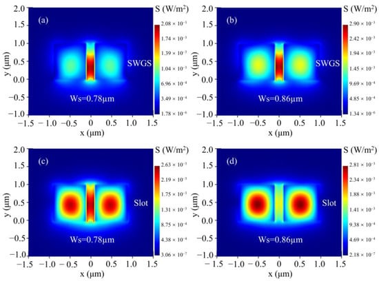 The distribution of the Poynting vector on the cross-section for SWGS waveguide when Ws is (a) 0.78 µm; (b) 0.86 µm; for slot waveguide when Ws is (c) 0.78 µm; (d) 0.86 µm.