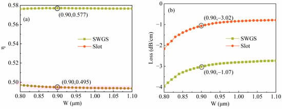 (a) Variation of η versus W; (b) variation of propagation loss versus W for the SWGS and slot waveguide.