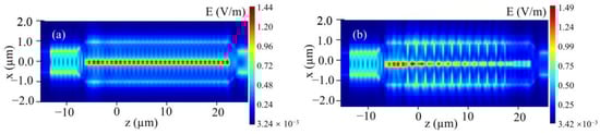 The sensor mainly includes three parts: the conversion from the strip waveguide to the slot waveguide, the transmission of light in the slot waveguide or the SWGS waveguide, and the coupling of light from the slot waveguide to the strip waveguide. Most of the propagating optical field is confined in the slot region of tens of nanometers. The light in the sensing region is contacted by the gas to be measured for absorption. Figure 6a,b display the electric field distribution in the propagating direction with the SWGS and slot structure. The optical power released by the SWGS waveguide is higher than that of the slot waveguide. The SWGS will increase the propagation loss of the SWGS waveguide, so when determining the parameters, the transmission loss of the SWGS waveguide should be minimized.