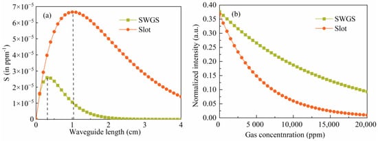 When monitoring the CO2 gas, the concentration of gas is assumed for 1 ppm, and the sensitivity as a function of absorption length for the SWGS and slot waveguide, as shown in Figure 7a. Although the SWGS waveguide releases more optical energy to interact with the gas, its sensitivity is lower than slot waveguide, because the transmission loss of the SWGS waveguide is too high. The sensitivity of the SWGS and slot waveguide can reach 2.60 × 10−5 (ppm−1) and 6.66 × 10−5 (ppm−1). The waveguide length is called the optimum length when the sensitivity is at its highest, and the optimum lengths of the two structures are 0.33 cm and 1.02 cm, respectively. It is a higher η of the SWGS structure that leads to a shorter optimum length.