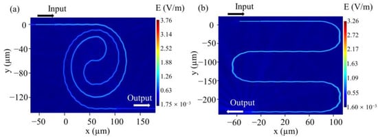 The electric field distribution with different structures: (a) spiral structure of slot waveguide; (b) meander structure of slot waveguide.