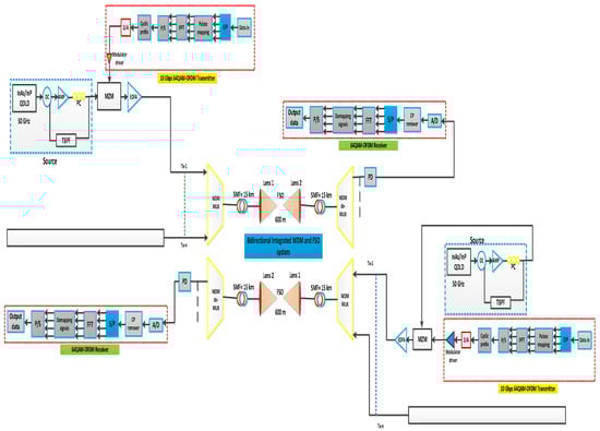 The Wavelength Division Multiplexing (WDM) based optical communication has successfully achieved the bandwidth requirements, particularly for the end users. The WDM enabled optical network technology is shifted to the WDM based passive optical network (WDM-PON), purposing to fulfill end users’ high capacity and multi-user demands []. However, the existing WDM-PON cannot perform well for large coverage areas and the user’s positions where the fiber has to be deployed over hilly areas, multistory buildings, and rivers. The WDM-PON uses the single mode fiber (SMF) for transmitting high data rate and multi-user data up to long distances []. This results in degrading the performance of the WDM-PON communication setup because of various losses like nonlinear and phase impairments. Therefore, new solutions are needed to tackle above mentioned limitations. Currently, the researchers are targeting the combined structure of free space optics (FSO), and optical fiber technology, which is an excellent choice for propagating high capacity information []. This methodology has organized the 5G communication based services, including long distance transmissions. On the other side, the current integrated optical fiber and FSO based 5G system faces new issues called Rayleigh backscattering (RB), which has bounded the system outcomes and distorts the mobility of 5G technology []. Furthermore, for next generation communication networks, the existing system is considered complex and costly. Thus, in order to design a less complex and cost effective model, various research works have been done so far. Researchers are pushing the 5G new radio (NR) to a higher band, specifically the sub-THz spectrum spanning between 100 and 300 GHz, due to recent advances in sub-terahertz (sub-THz) technology []. Due to its high data rates, 5G NR connections in the sub-THz spectrum are becoming more and more common. The high frequencies needed to increase data rates significantly are present in the sub-THz range []. The sub-THz band is highly suited for many future 5G applications that demand extremely fast data rates because of its high-frequency characteristics. The high-frequency property of 5G NR sub-THz communication enables the transmission of massive amounts of data across short distances. However, the significant air loss transmission window of 5G NR sub-THz communication limits the wireless transmission range. Due to its sub-THz connectivity limitations, 5G is appropriate for highly populated locations. In sparsely inhabited places, 5G sub-THz connectivity is not ideal because it cannot deliver signals through long-range wireless transmission. Researchers have naturally looked into other high frequency bands, especially the sub-terahertz (sub-THz) band, which is placed above the millimeter-wave (MMW) band, given the expanding use of MMW communications []. The sub-THz spectrum can be used in various developing applications that demand high access data rates because of its enormous bandwidth. MMW and sub-THz communications can deliver fast data rates across close ranges due to their properties. The MMW and sub-THz bands of 5G NR are more suitable for short-range wireless transmission than long-range wireless transmission due to their communication restrictions []. Aiming the transmission rates at several tens of Gb/s while employing an integrated fiber optics and FSO-based 5G NR system for the simultaneous transmission of 5G MMW and sub-THz signals is a potential strategy for accomplishing the goals of high transmission capacity and long-haul transmission. By fusing long-reach fiber-FSO convergence with short-range 5G wireless extension, the combined fiber optic and FSO enabled 5G NR system is capable of high transmission capacity, high access data rates, long-haul transmissions, and broad service regions. In [], the authors have shown recent progress on FSO technology and the factors that interpret the outcomes. The study in [] evaluates the performance of the FSO system in diverse geographical locations. The channel induced limitations are mitigated using orthogonal frequency division multiplexing (OFDM) and digital signal processing (DSP) techniques. A. Bekkali et al. [] suggested a full duplex and all FSO transceivers and evaluated its performance. The quality factor and electrical power were investigated for FSO links in [], and simulation analyses were performed using an optisystem. Intensity modulation and direct modulation (IM/DD) FSO link was studied in [] in terms of bit error rate (BER). Ref. [] explained the OFDM mode division multiplexing (OFDM-MDM) based FSO transceiver. The dust effect is estimated using the signal-to-noise ratio (SNR) and total power as key measuring parameters. The impact of sandstorm conditions was analyzed in [] for FSO links. The backhaul network was introduced in [] for a 5G based FSO system, and the performance is evaluated and compared with a conventional FSO link. In [], the role of the FSO framework was investigated for the next generation satellite communication system. However, the COVID-19 pandemic has pushed the online application and marketing services and overburdened the already installed FSO setups. In this paper, the free space optics (FSO) link is modeled with wavelength division multiplexing (WDM) technology based optical fiber system, purposing to enhance the 5G capabilities in multi-channel, high distance, and bidirectional transmissions. The major contribution of this paper are summarized as follows