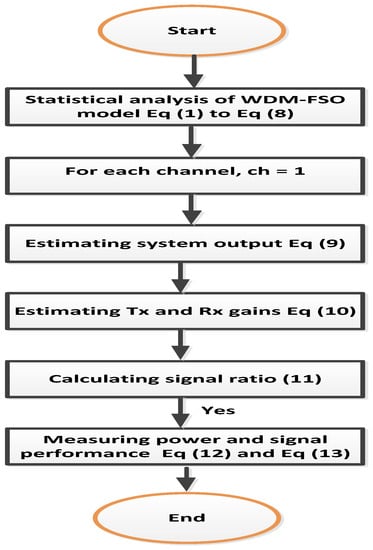The remaining sections of this paper are managed as follows. Section 2 describes the proposed experimental model, the theoretical background of the presented WDM-FSO link is discussed in Section 3, Section 4 mentions the results and discussion of the estimated simulation model designed based on the mathematical model, and the conclusion is summarized in the final section (Section 5).